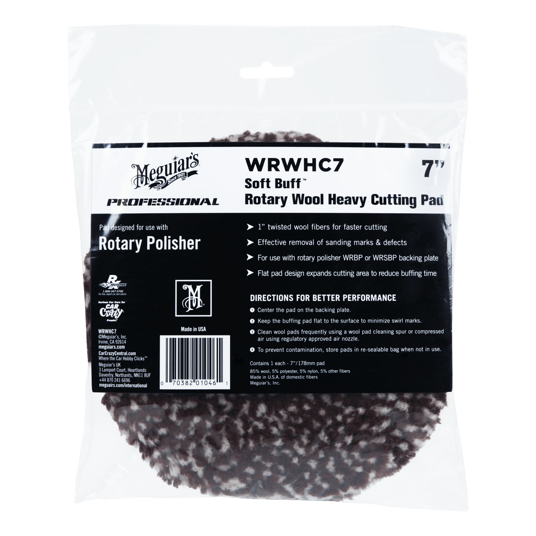 Meguiar’s Rotary Wool Heavy Cutting Pad 7″ är designad för att ge högsta möjliga avverkning vid grovpolering. De täta, tvinnade ullfibrerna arbetar effektivt bort tunga defekter, oxidation och djupa repor utan att överhetta ytan. Rondellen är platt för optimal kontakt med lacken och säkerställer jämn bearbetning över hela ytan.